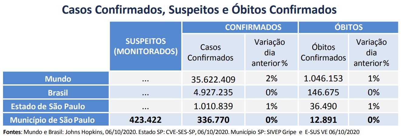 Segundo dados do boletim diário publicado pela Secretaria Municipal de Saúde de São Paulo sobre a pandemia do novo coronavírus (causador da Covid-19), nesta terça-feira (06/10) a capital paulista contabiliza 12.891 vítimas da Covid-19.